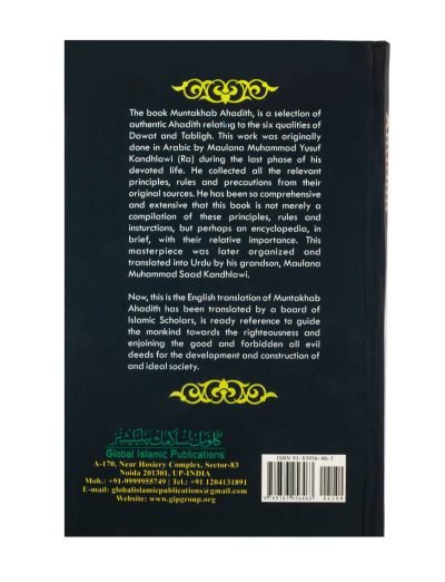 Muntakhab Ahadees is a collection of hadith (Prophet’s Teaching) related to the Six Qualities of Da’wat and Tabligh which includes Kalima tayyibah (Attestation of faith), Salat (Prayer), Ilm-o-zikr, (Knowledge of Islamic texts), Ikram-e-Muslim (Respect for Muslims), Ikhlas-e-Niyat (Purity of intention and sincerity), Da’wah (invitation or call). It includes certain selected Verses (Ayats), authentic hadith and explanations from classical & contemporary scholars