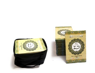 This para set includes all 30 paras of the Qur’an, covering every part needed for study, memorization, and daily recitation. As a result, readers can benefit from a comprehensive, easy-to-use guide that supports proper pronunciation and rhythmic reading. The hardcover binding ensures durability, while the included black canvas bag provides portability and protection, making it convenient for travel or carrying to study circles.