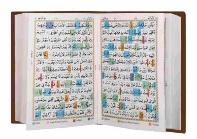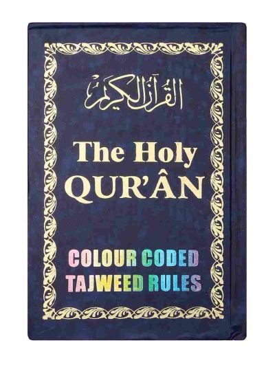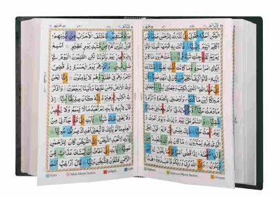 This is a Holy Qur’an that contains colour Coded Tajweed rules in English. Seven different colour shades have been used, each representing a Tajweed rule. It helps the reciter to emphasize the accent, phonetics, and rhythm of the Quranic recitation. It also helps the reciter to know how to pronounce the letters & on which letter emphasis must be laid.